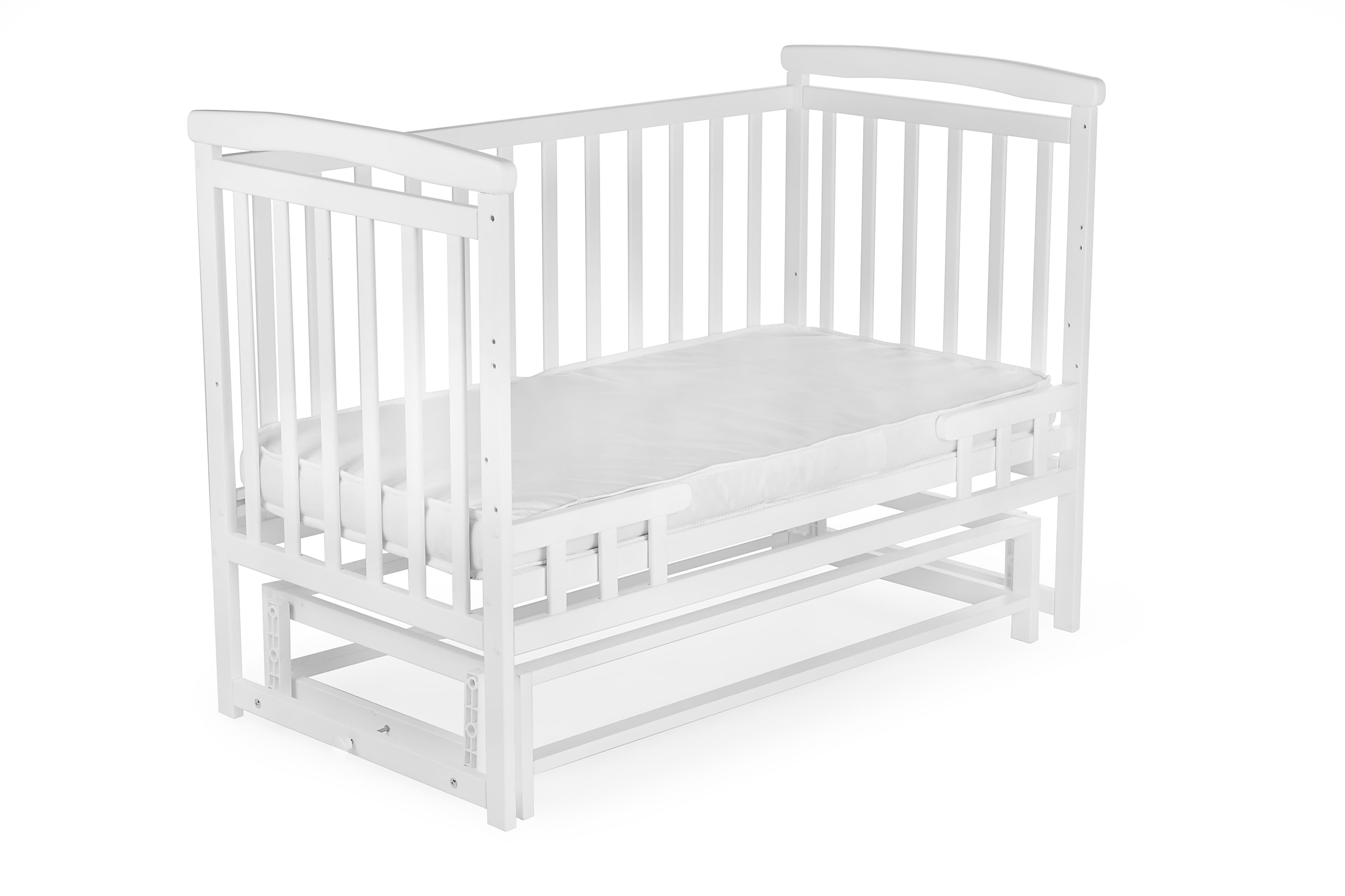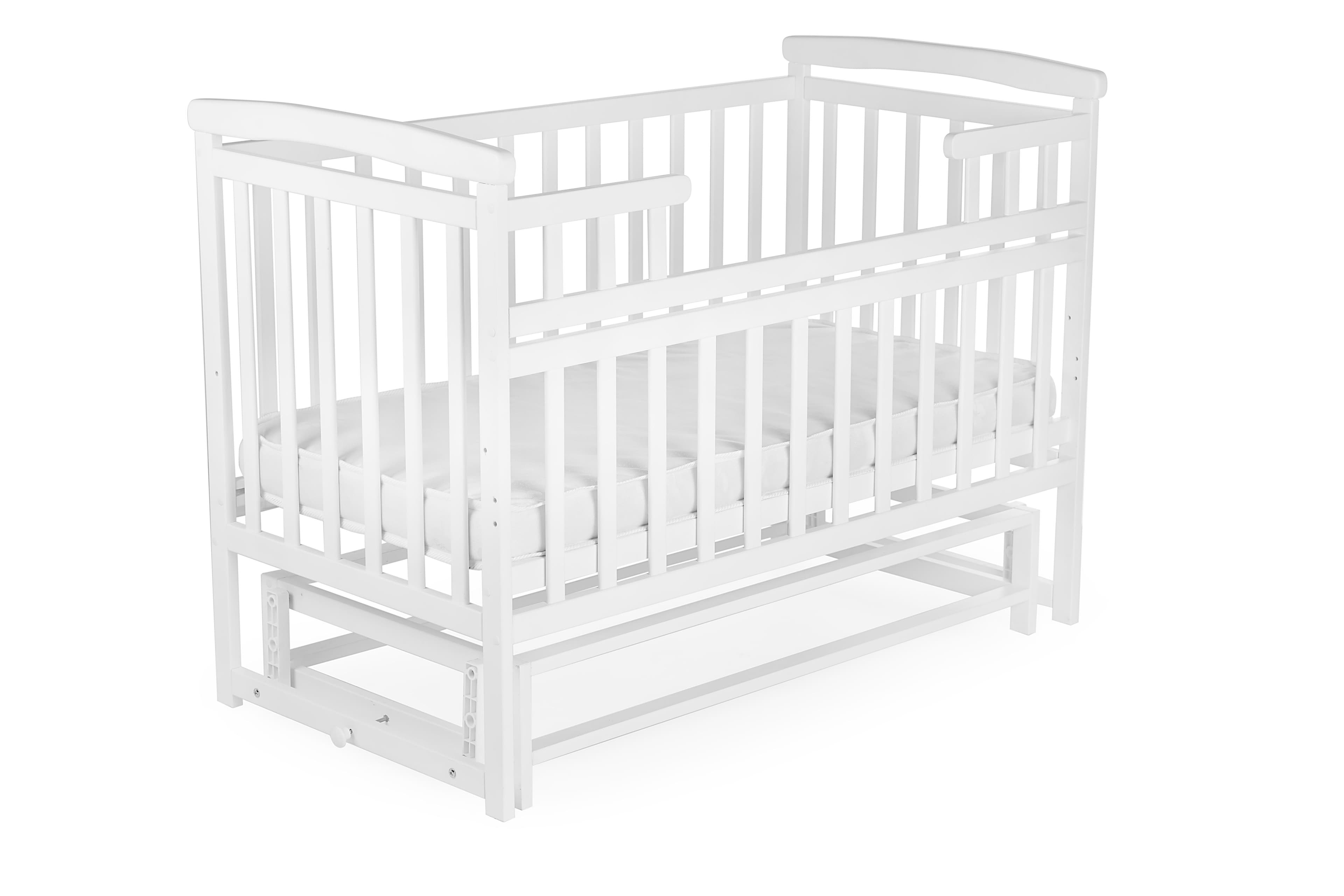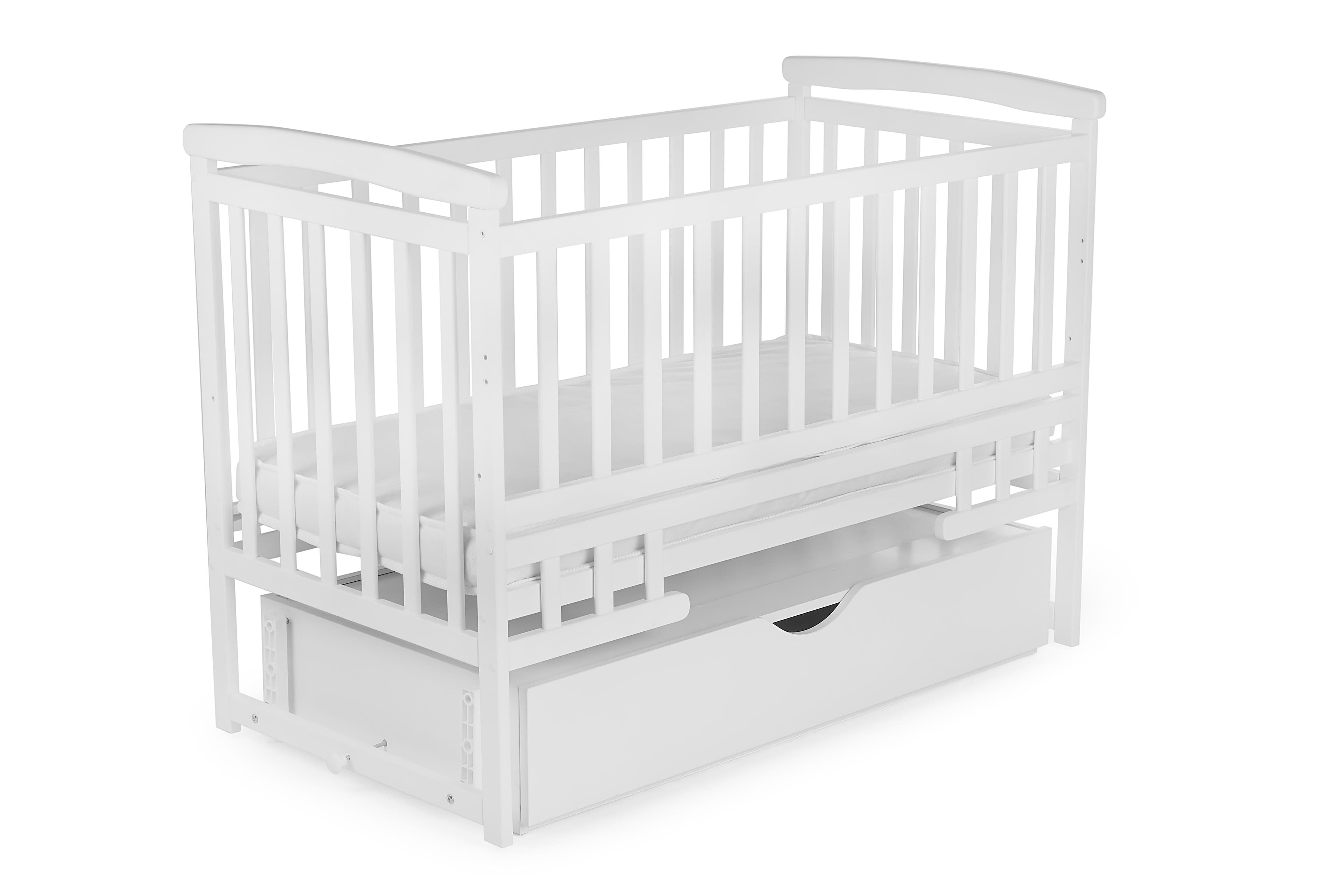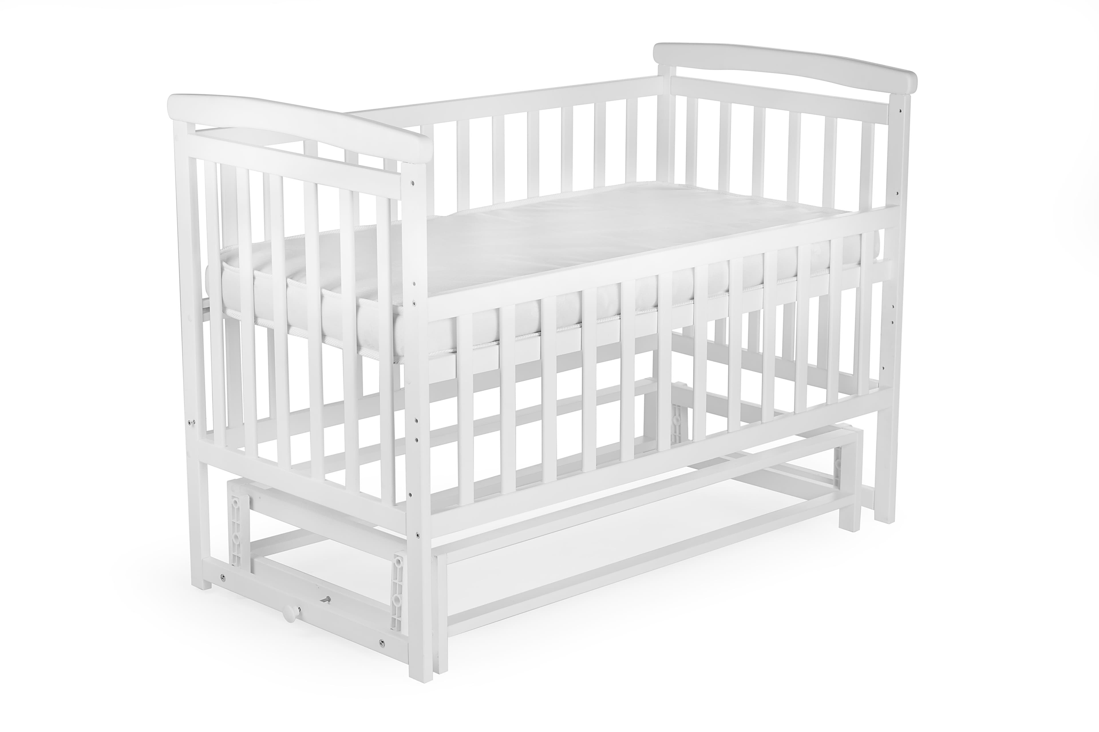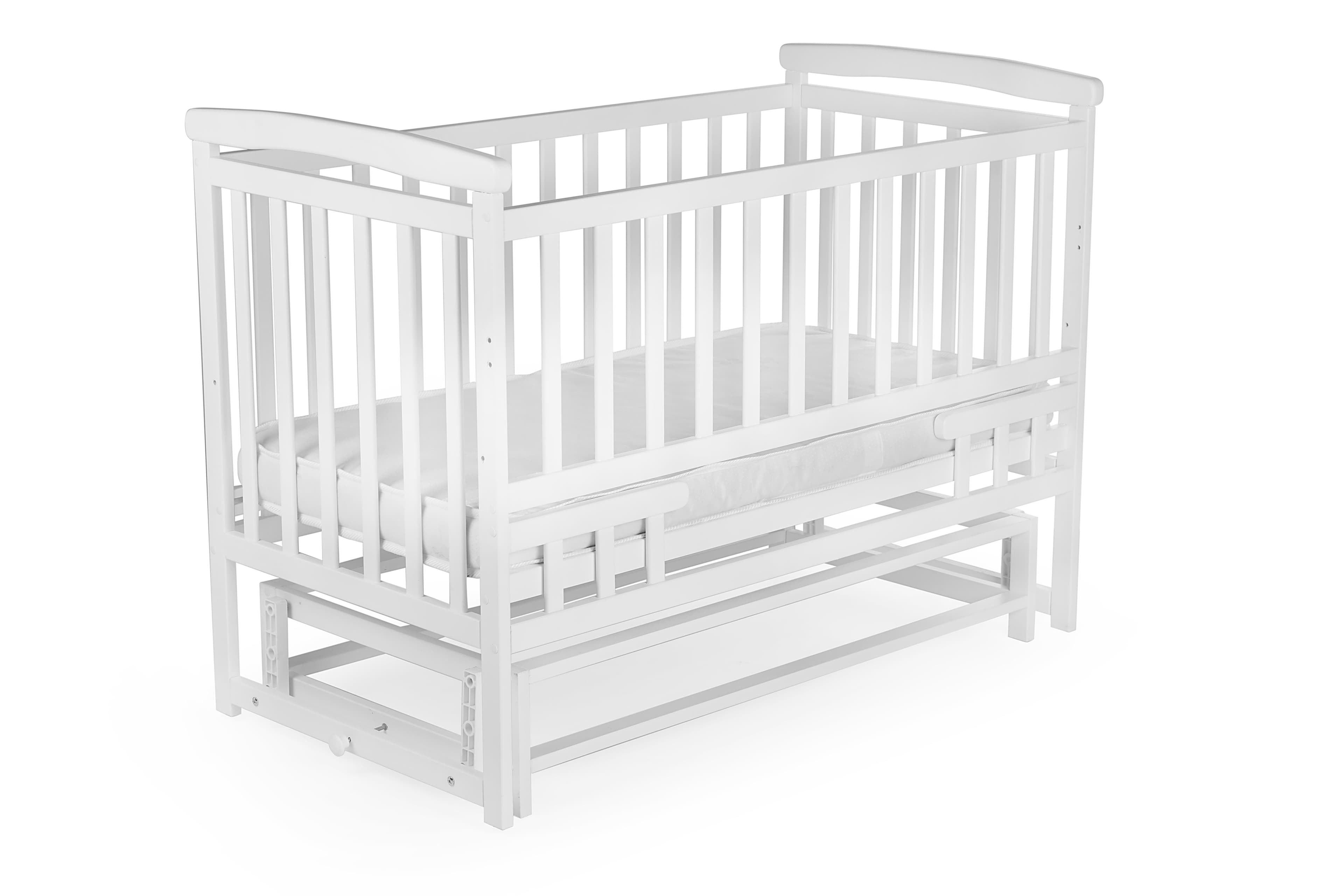 The bed is made of solid beech — eco-friendly, durable, and child-safe. It’s coated with non-toxic, water-based varnish and paint. Features include two height levels, rounded safe edges, and a pendulum mechanism with lock