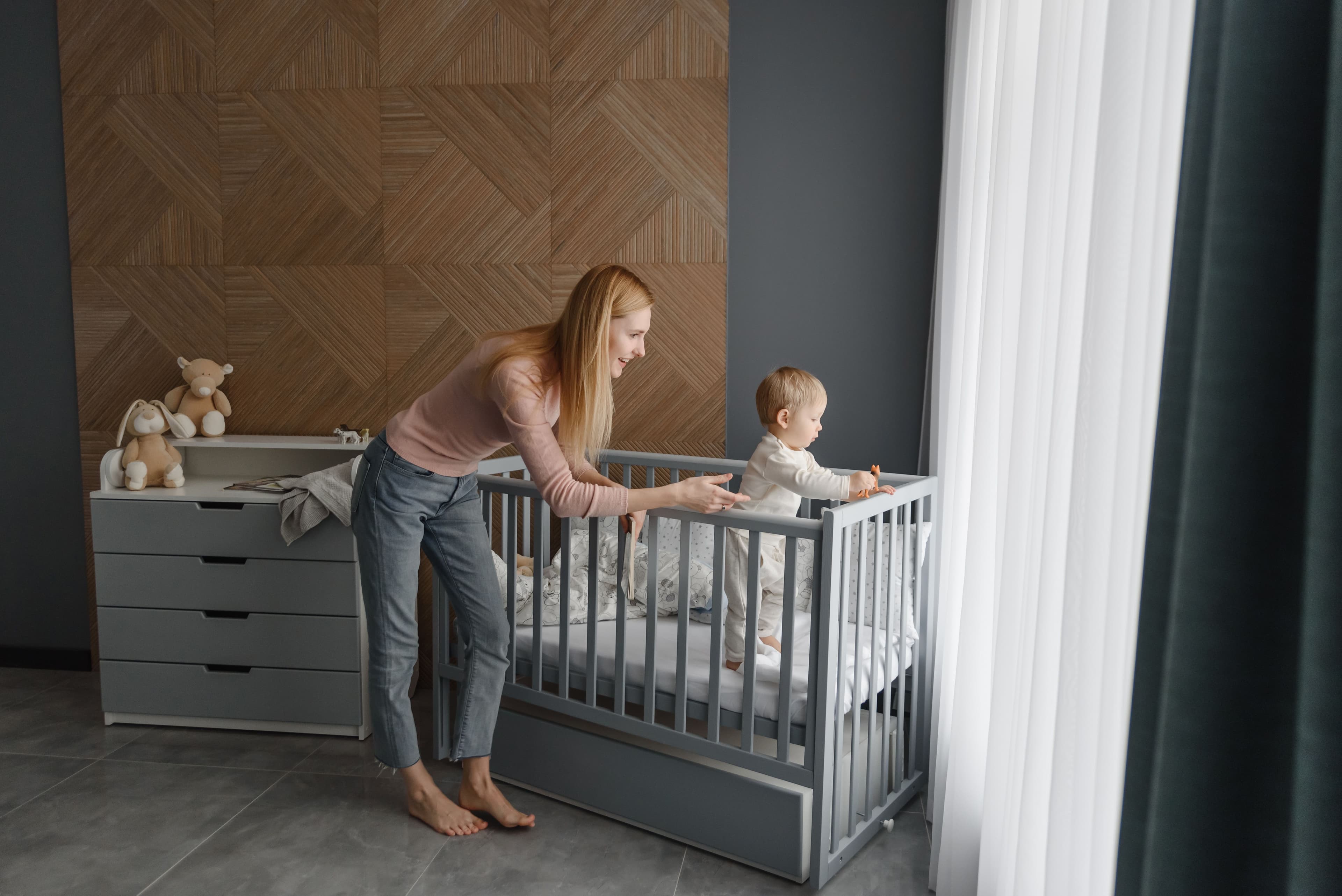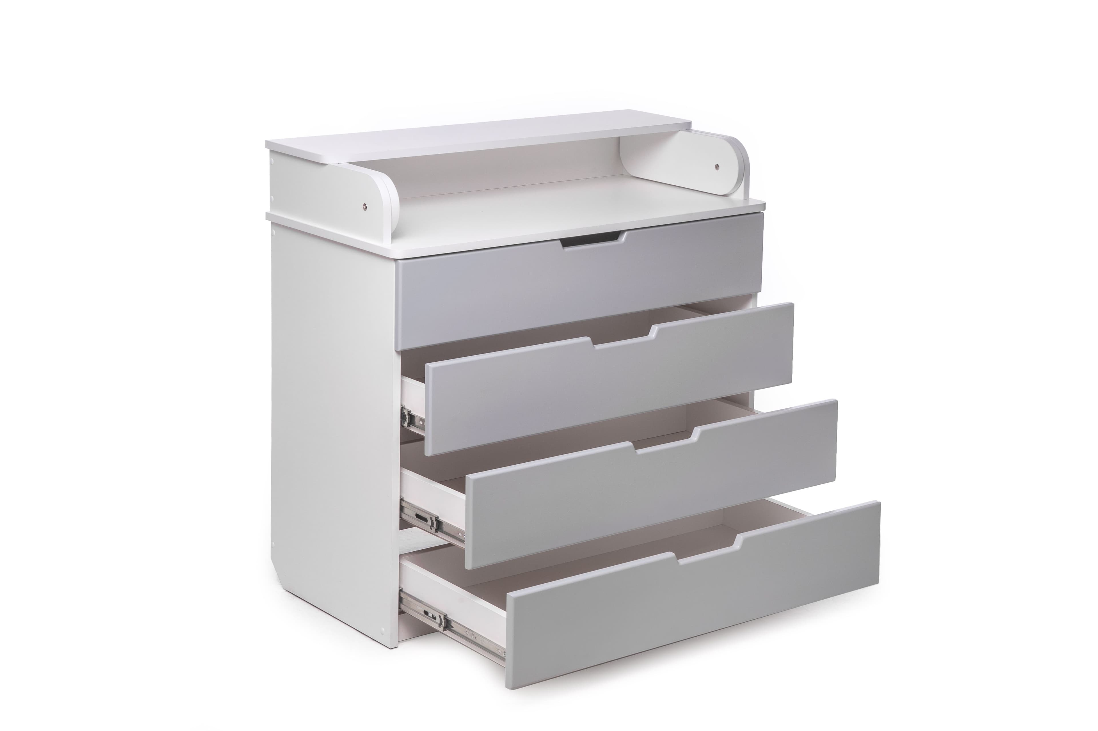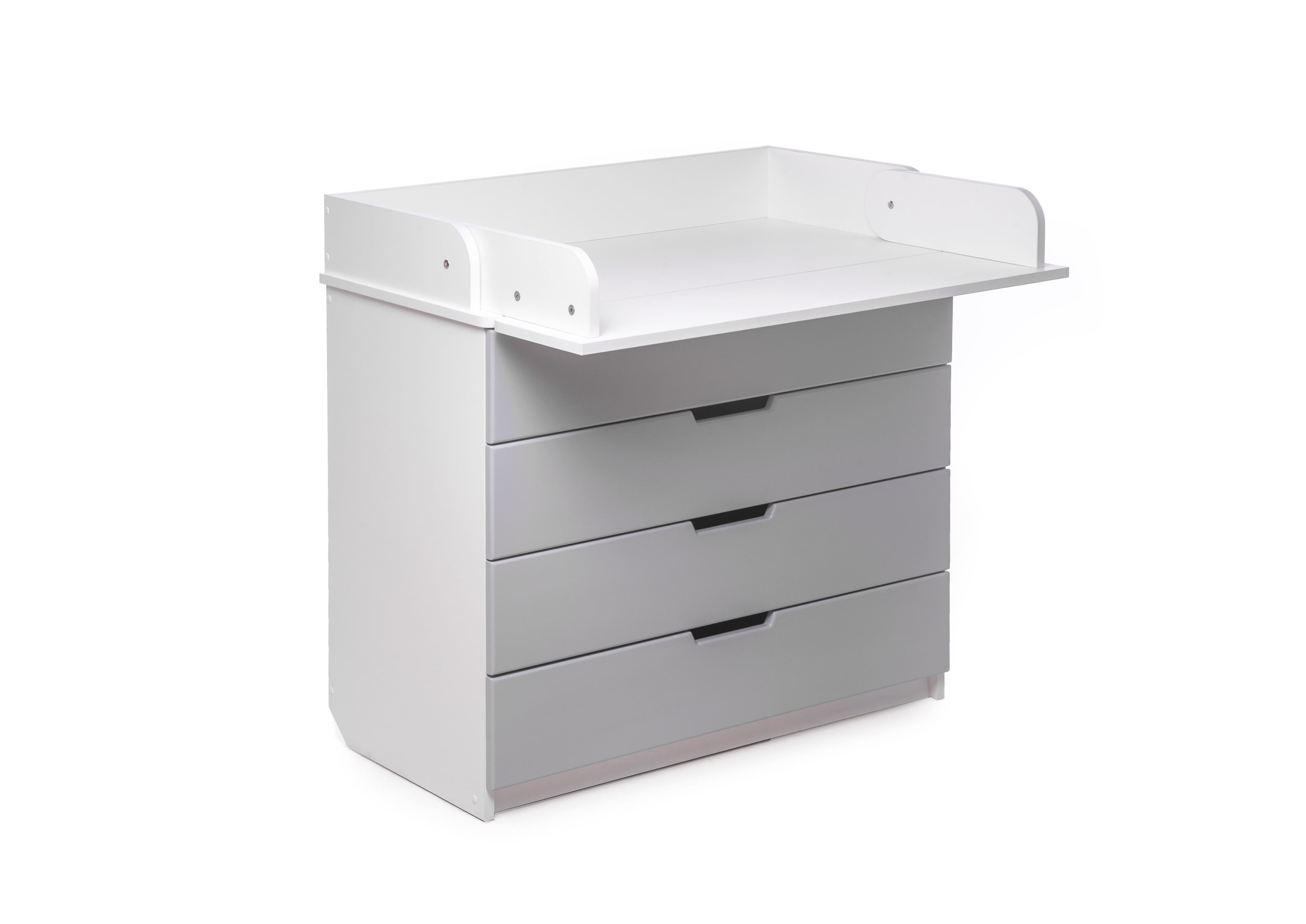 The changing chest stores newborn essentials in four drawers. The top folds into a removable changing table with rounded sides. Made of natural materials and laminated chipboard